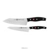 Les deux couteaux signature en acier inoxydable facilitent le travail de préparation. ce couteau polyvalent de style asiatique coupe, tranche, dés et hache. la lame présente de petites empreintes, appelées Grantons, pour empêcher les aliments de coller.