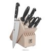 - Couteau à éplucher le bec d’oiseau de 2,75″, couteau d’office de 4″, couteau utilitaire dentelé de 5″, couteau de préparation à bord fin de 5,5″, couteau santoku de 7″, couteau à pain de 8″, couteau à pain de 8″ couteau de chef, cisailles doubles, acier double de 9″, bloc de rangement